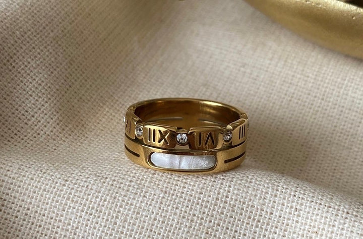 خاتم روماني ذهبي بتصميم عريض يتكون من قطعتين متداخلتين أنيقتين، الجزء العلوي مزين بنقوش أرقام رومانية متراصة بين فصوص صغيرة شفافة تضفي لمعة راقية، والجزء السفلي يحمل قطعة مستطيلة من الميكا البيضاء تعزز من جمالية التصميم. الخاتم مصنوع بلون ذهبي دافئ يعكس الفخامة والرقي. مطلي بالذهب عيار 18 مكفول سنة لتغير اللون.