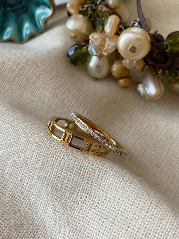 خاتم مكون من قطعتين متداخلتين بتصميم روماني كلاسيكي، حيث تأتي القطعة الأولى بشكل عريض مزينة بنقوش الأرقام الرومانية المفتوحة، والقطعة الثانية رفيعة مرصعة بفصوص صغيرة براقة تضيف لمسة من التألق والرقي. الخاتم باللون الذهبي الدافئ، مما يمنحه فخامة وجاذبية مميزة. مطلي بالذهب عيار 18 مكفول سنة لتغير اللون.