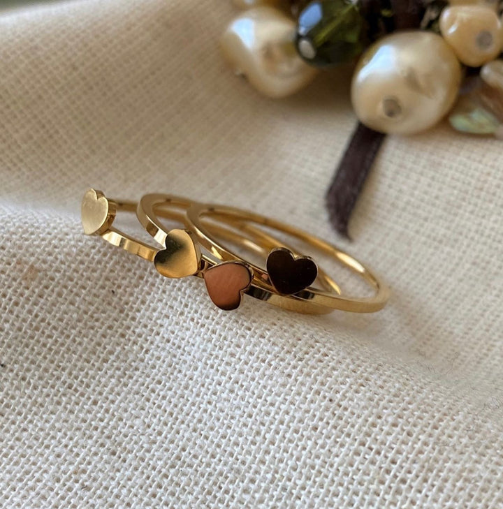 خاتم رفيع أنيق بتصميم ثلاث قطع متصلة، تضم ثلاث قلوب مميزة بألوان متعددة منها الذهبي والبرونزي، تضفي لمسة عصرية وحيوية على الإطلالة. يتميز الخاتم ببساطة التفاصيل ونعومة الخطوط التي تجعله مثالياً للاستخدام اليومي. مطلي بالذهب عيار 18 مكفول سنة لتغير اللون.