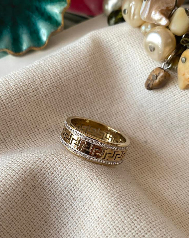 خاتم ذهبي عريض مزين بنقوش هندسية متناسقة على كامل عرضه، محاط بإطار من الفصوص الصغيرة البراقة التي تضفي لمسة من الفخامة والأناقة. التصميم يجمع بين البساطة والزخرفة الدقيقة ليبرز تفاصيل الخاتم بشكل متوازن وجذاب. مطلي بالذهب عيار 18 مكفول سنة لتغير اللون.