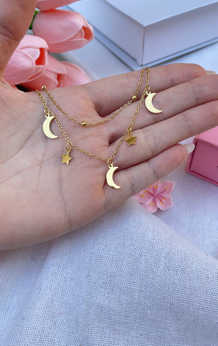 خلخال أنيق مصنوع من سلسلة رفيعة باللون الذهبي تتألق بثلاثة تعليقات على شكل نجوم وأقواس قمر مصقولة بدقة تعكس الجمال والرومانسية. تصميم مزدوج الطبقات يضفي لمسة عصرية مميزة تناسب كل الأوقات والمناسبات. مطلي بالذهب عيار 18 مكفول سنة لتغير اللون.