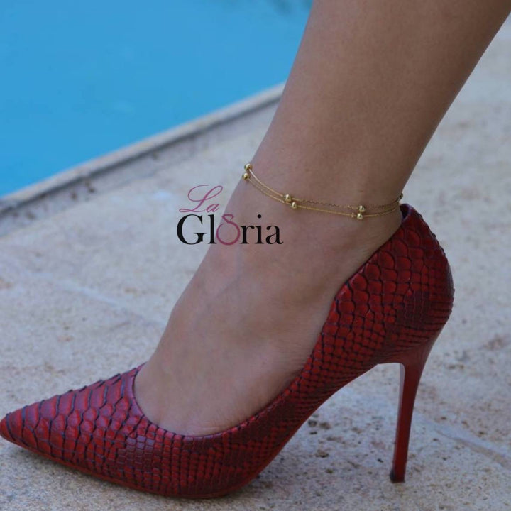 خلخال أنيق بتصميم سلسلة مزدوجة رفيعة باللون الذهبي، مزين بحبات كروية صغيرة متفرقة تضيف لمسة ناعمة وأنثوية على الكاحل. يتميز بخفة وزنه وبساطته التي تناسب مختلف الأزياء والمناسبات. مطلي بالذهب عيار 18 مكفول سنة لتغير اللون.