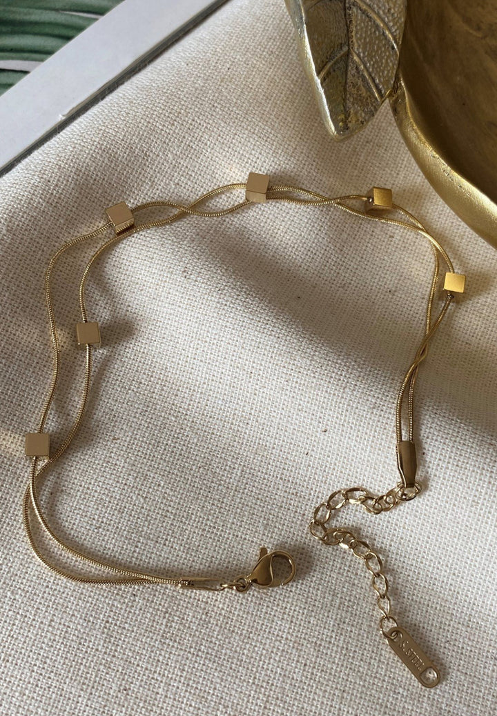 خلخال أنيق بتصميم مزدوج من السلاسل الناعمة باللون الذهبي الفاتح، مزين بقطع مكعبية بارزة تتوزع بتناسق على طول السلسلة. يتميز الخلخال بقفل محكم وسلسلة قابلة للتعديل لضبط الطول حسب الرغبة. تصميمه البسيط والفاخر يضفي لمسة عصرية ورقي على القدم. مطلي بالذهب عيار 18 مكفول سنة لتغير اللون.