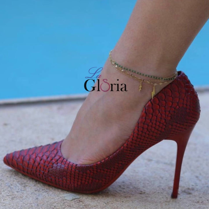 خلخال أنثوي أنيق يتكون من عدة سلاسل دقيقة متداخلة باللون الذهبي، مزين بأشكال رقيقة من الصواعق المعلقة التي تضفي لمسة عصرية وحيوية على الكاحل. تصميمه الرشيق والخفيف يجعل منه قطعة مثالية للمناسبات الكاجوال والرسمية على حد سواء. مطلي بالذهب عيار 18 مكفول سنة لتغير اللون.