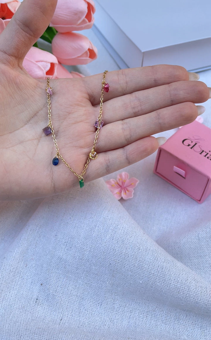 خلخال بأناقة سلسلة ذهبية رقيقة تتدلى منها أحجار ملونة بأشكال هندسية متنوعة تضفي لمسة من الحيوية والأنوثة على القدم. تصميمه المميز يوازن بين البساطة واللمعان ليبرز إطلالتك بأسلوب رقيق وجذاب. مطلي بالذهب عيار 18 مكفول سنة لتغير اللون.