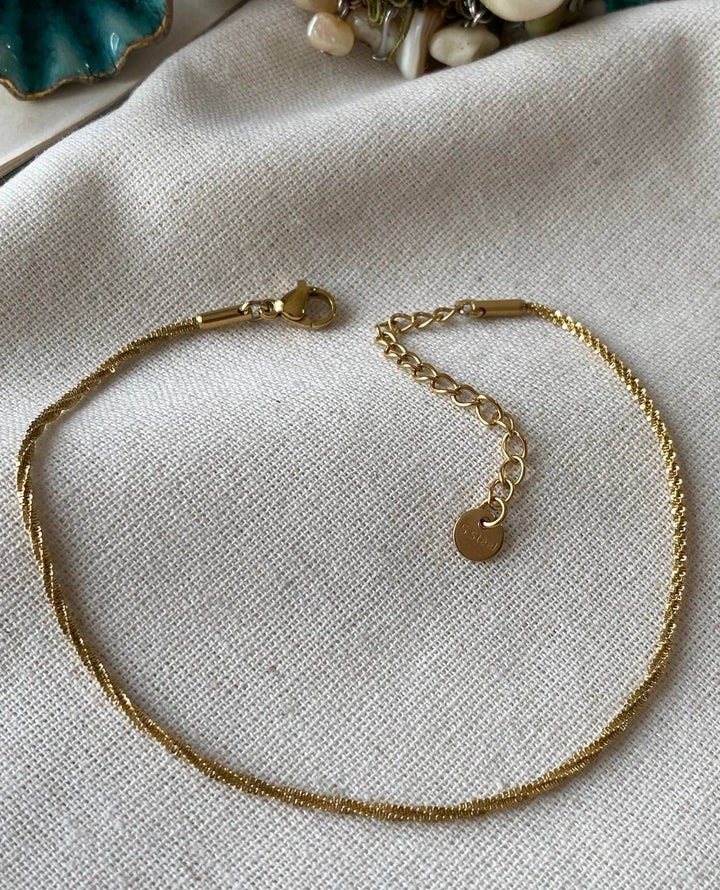خلخال أنيق بتصميم سلسلة رفيعة ملتفة بشكل ناعم يضفي لمسة دقيقة وجذابة على الكاحل. يتميز بلونه الذهبي اللامع والزينة البسيطة التي تعكس الفخامة والرقي، مع قفل محكم وسلسلة توسيع لضبط المقاس بسهولة. مطلي بالذهب عيار 18 مكفول سنة لتغير اللون.