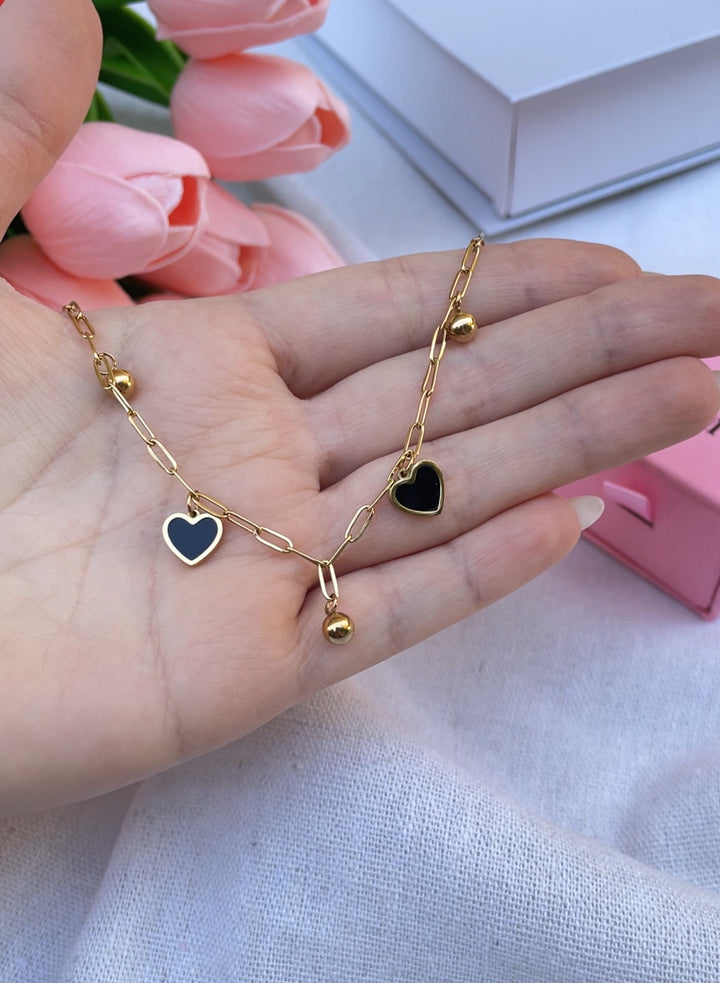 خلخال بتصميم سلسلة معدنية بأحجار مستطيلة متشابكة بلون ذهبي فخم، مزين بحلية قلب بتدرج أسود توحي بالأناقة والعصرية، مع وجود كرات صغيرة ذهبية تتدلى بخفة لتعزيز الإطلالة الأنثوية. تصميم أنيق يناسب المناسبات اليومية والخاصة. مطلي بالذهب عيار 18 مكفول سنة لتغير اللون.