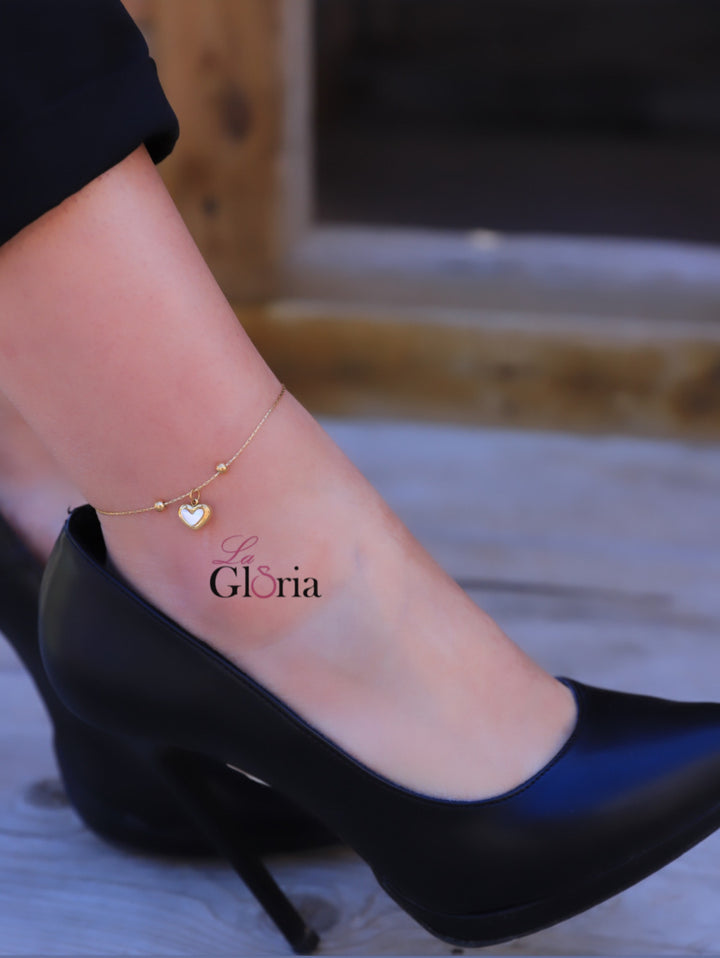 خلخال سلسلة ذهبية ناعمة بتصميم دقيق يلتف حول الكاحل بأناقة، مزين بقلادة على شكل قلب مفرغ بوسط أبيض ولمسات من حبات صغيرة متفرقة تضيف لمسة من الفرح والبراءة على التصميم. خلخال ناعم يجمع بين البساطة والرقي، مطلي بالذهب عيار 18 مكفول سنة لتغير اللون.