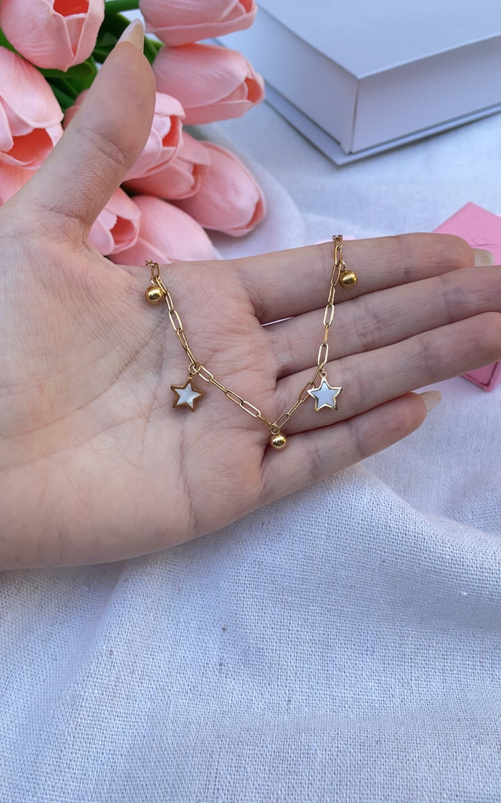 خلخال أنيق بتصميم سلسلة ذهبية من حلقات مستطيلة متصلة، مزين بثلاثة تعليقات مزخرفة بشكل نجوم بيضاء لؤلؤية ولافتة للأنظار، مع كرات ذهبية صغيرة تضيف لمسة من البهجة والديناميكية. يتميز الخلخال بخفة وزنه وتصميمه العصري الذي يبرز جمال القدم بأسلوب فاخر. مطلي بالذهب عيار 18 مكفول سنة لتغير اللون.