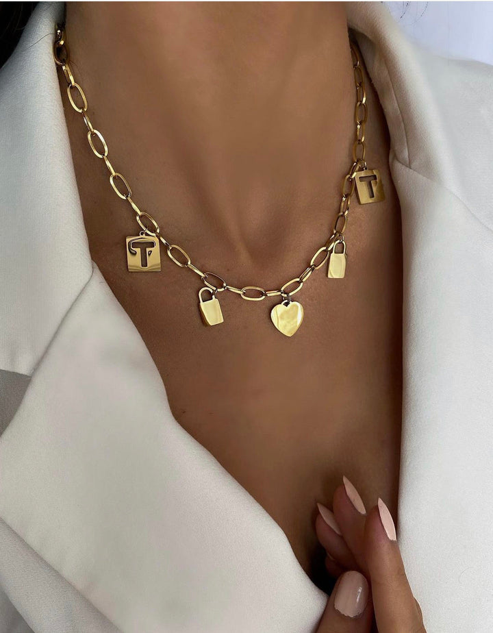 سلسلة أنيقة مصممة بسلسلة حلقات متوسطة الحجم مزينة بأقفال وقلب على شكل قلادة تضفي لمسة عصرية وجذابة على طلتك اليومية. مطلية بالذهب عيار 18 مكفولة سنة لتغير اللون.