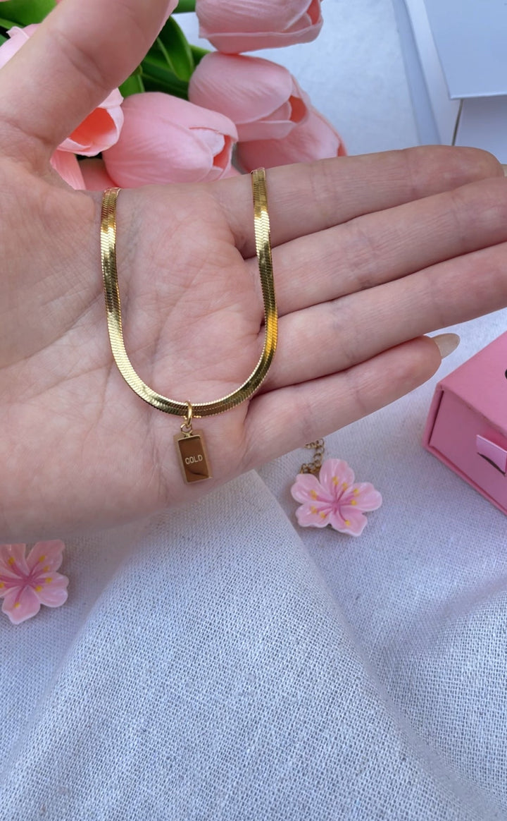 سلسلة أنيقة بتصميم مسطح وناعم مع قلادة صغيرة تحمل كلمة "GOLD" تعكس فخامة وبساطة الذهب الخالص. مطلية بالذهب عيار 18 مكفولة سنة لتغير اللون.