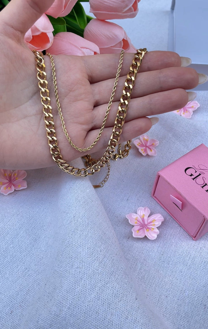 سلسلة التناغم الذهبي تجمع بين تصميم سلسلتين أحدهما بحبل ملتف رفيع والأخرى بسلسلة كبيرة متشابكة لخلق توازن رائع بين الرقة والقوة، تضفي لمسة عصرية أنيقة على إطلالتك اليومية. مطلية بالذهب عيار 18 مكفولة سنة لتغير اللون.