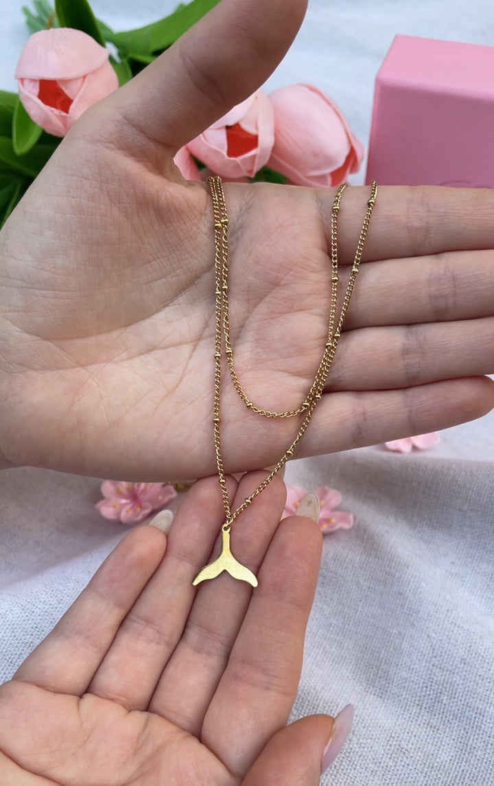 سلسلة أنيقة مزينة بقلادة على شكل ذيل حورية البحر تضيف لمسة أنثوية ناعمة وعصرية. تصميم السلسلة يتخلله نقاط صغيرة تعزز من جاذبيتها وأناقتها. مطلية بالذهب عيار 18 مكفولة سنة لتغير اللون.