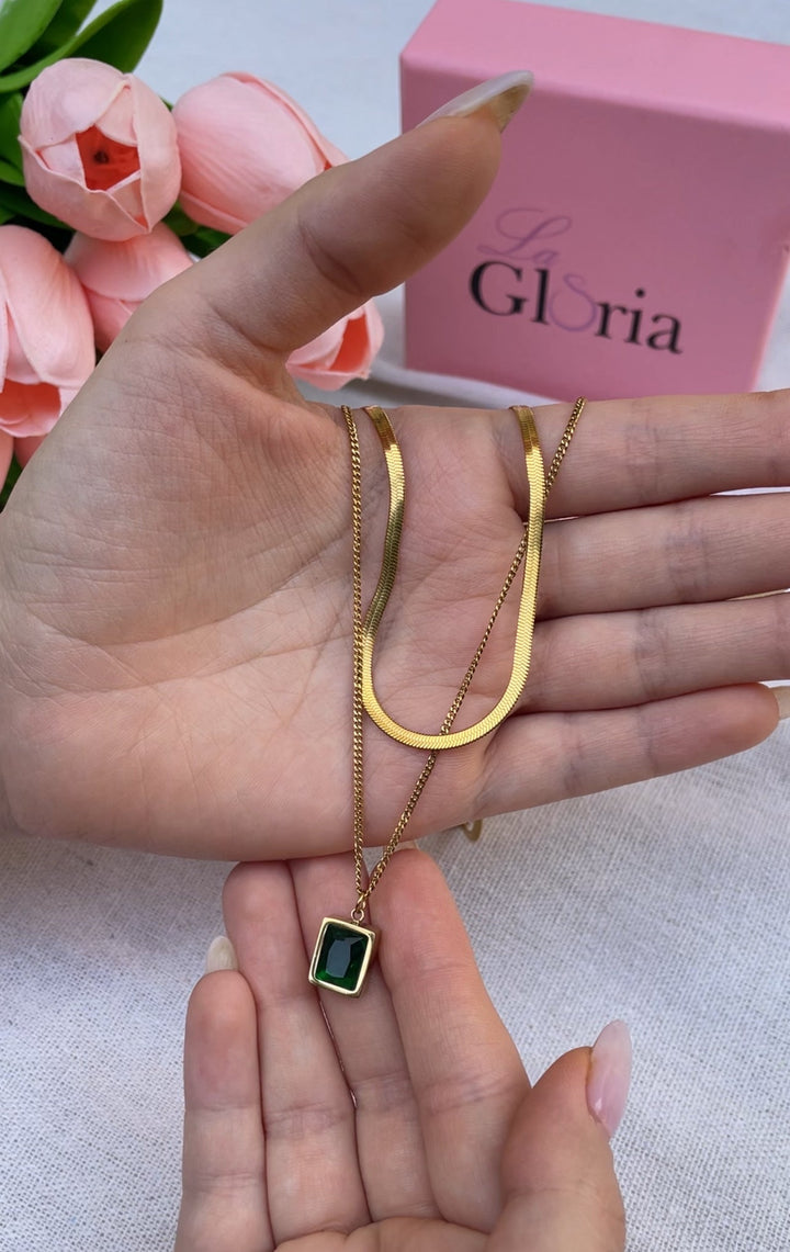 سلسلة أنيقة بطبقات متعددة تجمع بين تصاميم متداخلة مع قلادة مستطيلة مزينة بحجر زمرد أخضر يعكس الفخامة والجمال. مطلية بالذهب عيار 18 مكفولة سنة لتغير اللون.