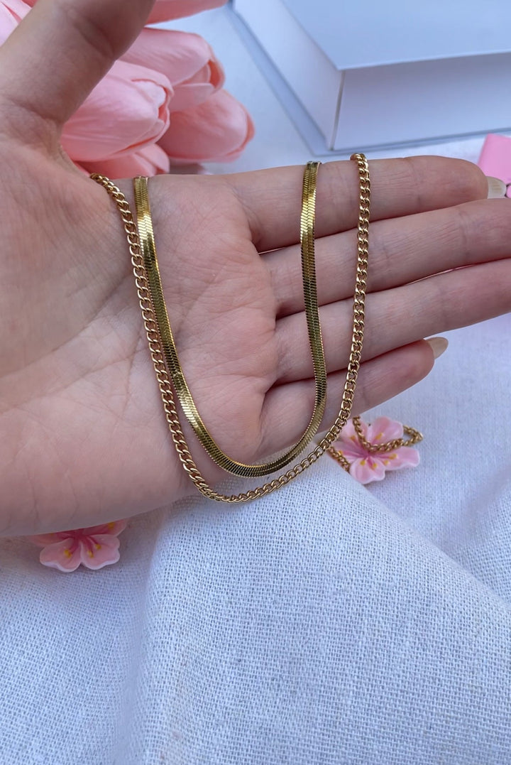 سلسلة أنيقة بتصميم مزدوج يجمع بين سلسلة مسطحة ناعمة وسلسلة بحلقات صغيرة متداخلة، تضفي لمسة عصرية راقية على عنقك. مطلية بالذهب عيار 18 مكفولة سنة لتغير اللون.