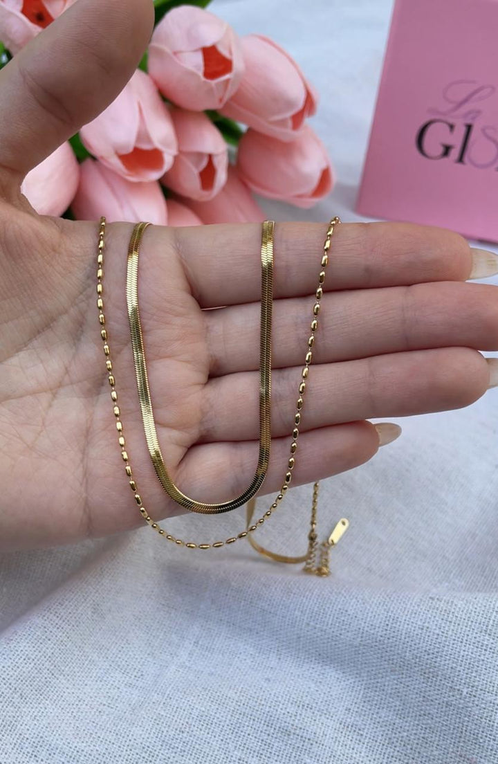سلسلة أنيقة بتصميم ناعم ولامع يجمع بين الخطوط المستقيمة والتفاصيل الدائرية الصغيرة التي تضفي لمسة حريرية ساحرة على العنق. مطلية بالذهب عيار 18 مكفولة سنة لتغير اللون.