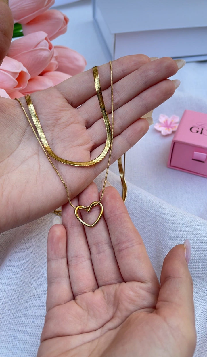 سلسلة أنيقة مزدوجة بتصميم ناعم، مزينة بقلادة على شكل قلب وسمكة تضفي لمسة رومانسية وعصرية على مظهرك. مطلية بالذهب عيار 18 مكفولة سنة لتغير اللون.