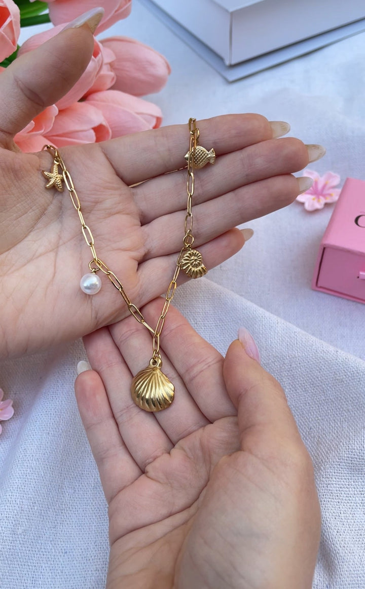 سلسلة ذهبية أنيقة بتصميم متشابك مزينة بقلائد على شكل صدفة بحر ونجمة بحر وحورية وخرزة لؤلؤية تضفي لمسة من الجمال والأنوثة. مطلية بالذهب عيار 18 مكفولة سنة لتغير اللون.