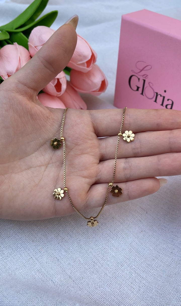 سلسلة أنيقة مزينة بزهور صغيرة متفرقة تضفي لمسة من النعومة والأنوثة على إطلالتك اليومية. مطلية بالذهب عيار 18 مكفولة سنة لتغير اللون.