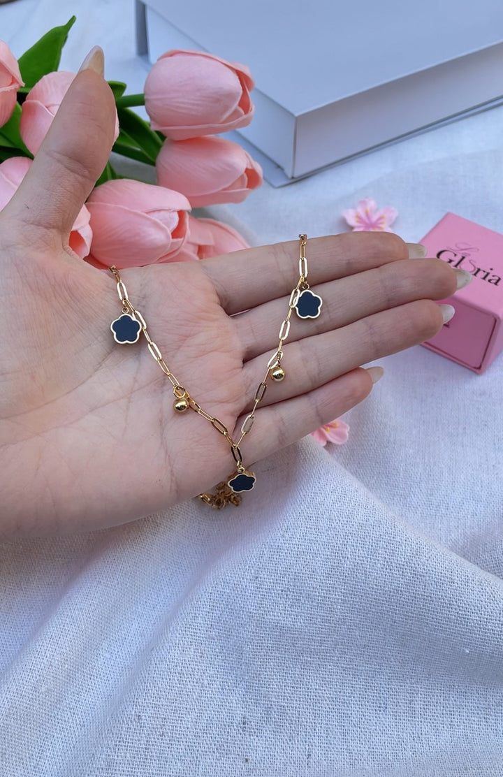 سلسلة أنيقة بتصميم قطع متطاولة مزينة بثلاث قلائد على شكل غيمة باللون الأسود مع كرات ذهبية تضفي لمسة عصرية مميزة. مطلية بالذهب عيار 18 مكفولة سنة لتغير اللون.