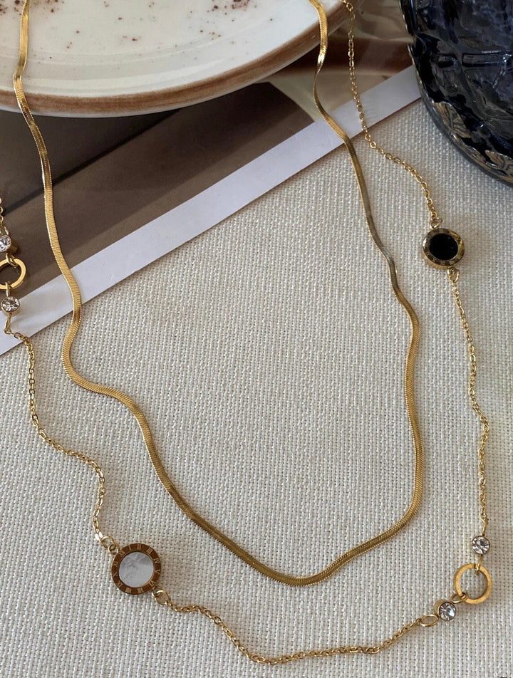 سلسلة الطبقات الرومانية أنيقة بتصميم مزدوج يجمع بين طبقة سلسلة مسطحة ناعمة وطبقة أخرى مزينة بقطع دائرية مزخرفة بالأرقام الرومانية وأحجار لامعة تضفي لمسة عصرية راقية. مطلية بالذهب عيار 18 مكفولة سنة لتغير اللون.