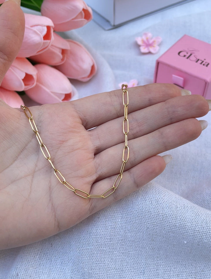 سلسلة أنيقة ذات تصميم مميز من حلقات مستطيلة متصلة تبرز البساطة والرقي في كل تفاصيلها. مطلية بالذهب عيار 18 مكفولة سنة لتغير اللون.