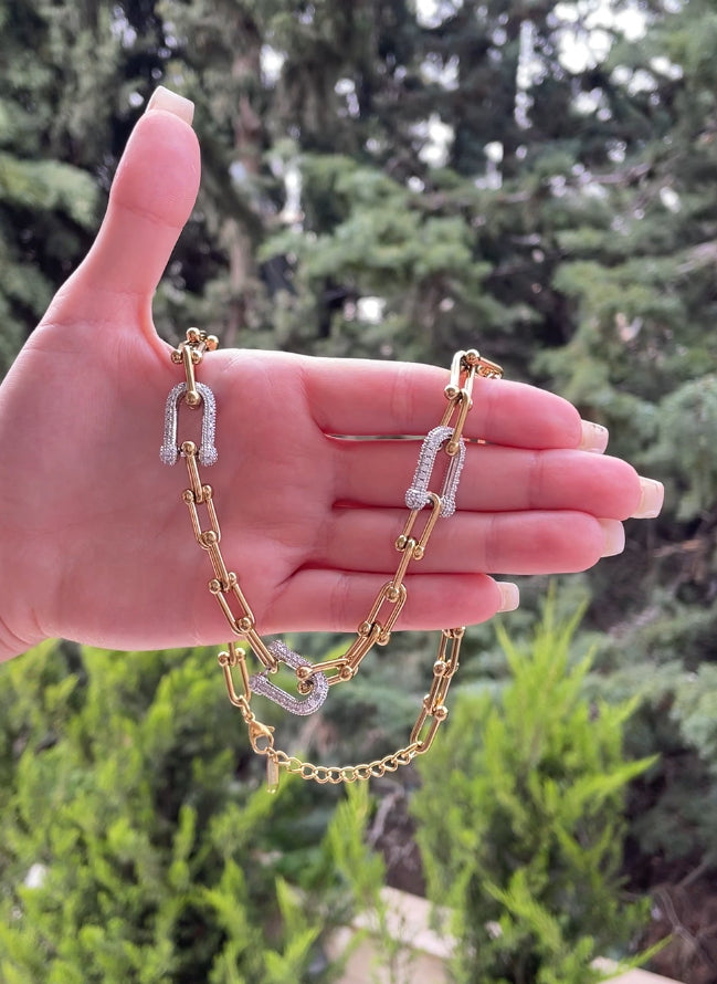سلسلة أنيقة ذات تصميم متداخل يجمع بين وصلات ذهبية مستطيلة وقطع مزينة بأحجار لامعة تضفي لمسة فاخرة وعصرية على إطلالتك. مطلية بالذهب عيار 18 مكفولة سنة لتغير اللون.