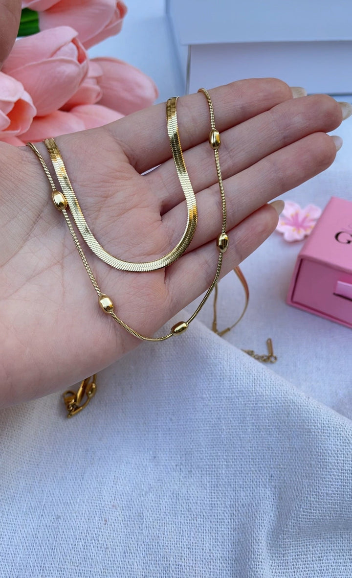 سلسلة أنيقة بتصميم مزدوج يجمع بين سلسلتين متباينتين: الأولى سميكة وناعمة بلمعان عاكس، والثانية رفيعة مزينة بحبات ذهبية تضفي لمسة عصرية وراقية على عنقك. مطلية بالذهب عيار 18 مكفولة سنة لتغير اللون.