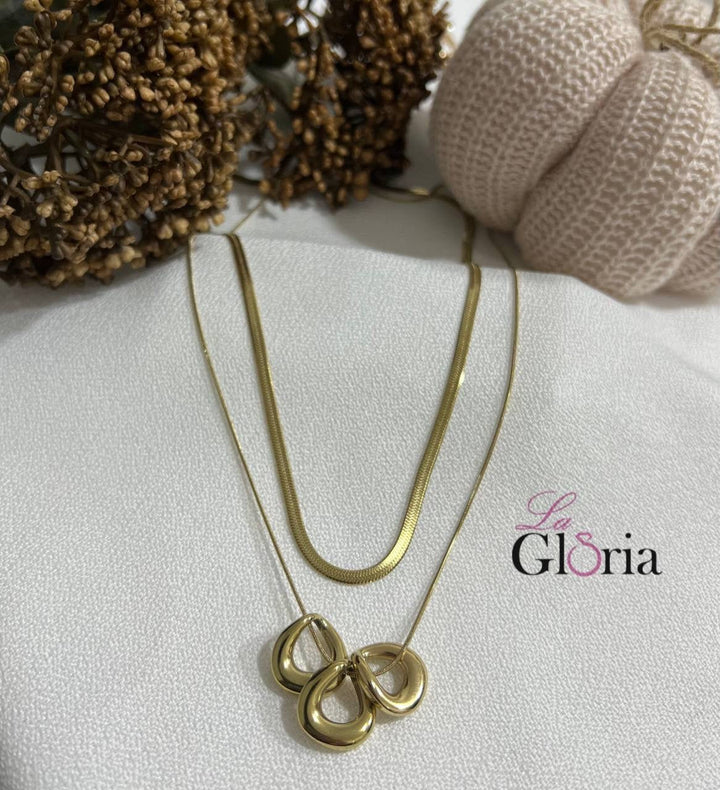 سلسلة أنيقة متعددة الطبقات بتصميم عصري يجمع بين خطين رفيعين وسلسلة عريضة مع قلادات بشكل منحني تضفي لمسة عصرية فريدة. مطلية بالذهب عيار 18 مكفولة سنة لتغير اللون.