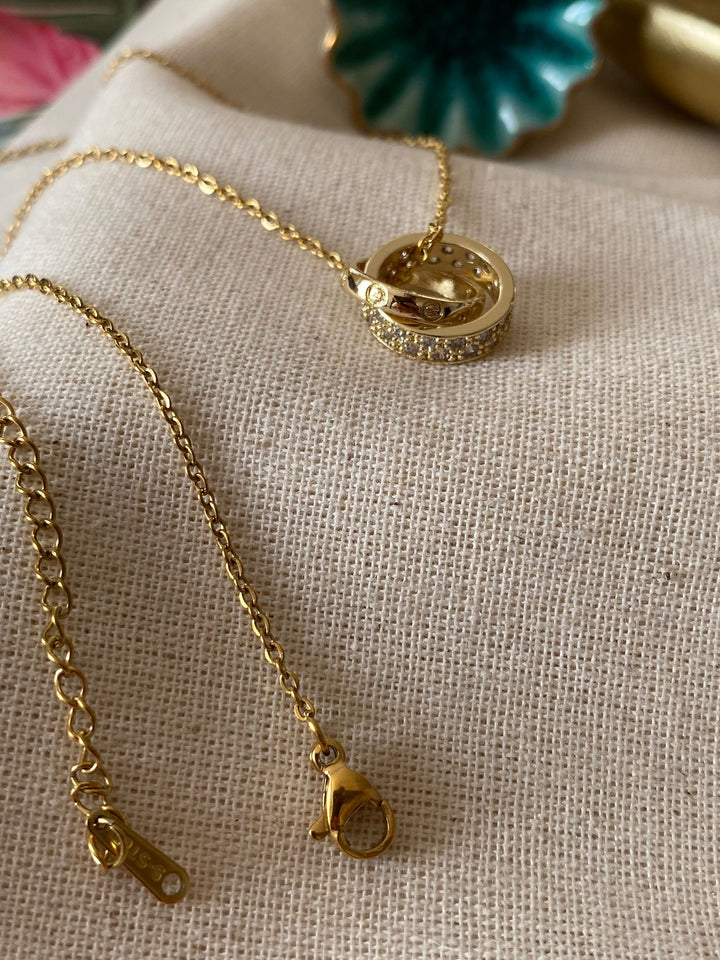 سلسلة أنيقة بتصميم دائرتين متداخلتين تبرز رمز الأبدية والتواصل، مزينة بأحجار لامعة تزيد من فخامتها ورقيها. مطلية بالذهب عيار 18 مكفولة سنة لتغير اللون.