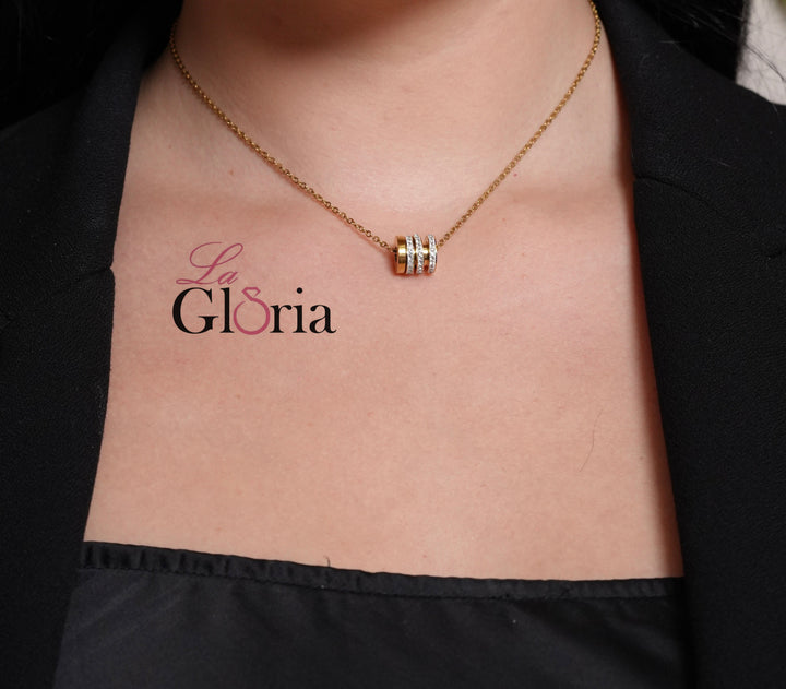 سلسلة أنيقة مزينة بثلاث حليات حلقية بتصميم متداخل يضفي لمسة من البريق والتميز على عنقك. مطلية بالذهب عيار 18 مكفولة سنة لتغير اللون.