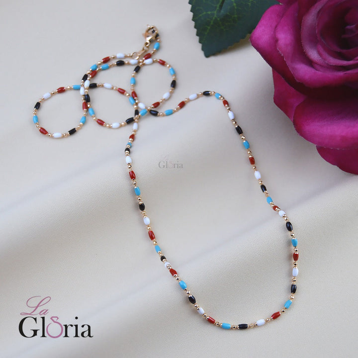 سلسلة أنيقة مكونة من خرز ملون يشكل توليفة مميزة من الأحمر والأزرق والأبيض مع لمسات ذهبية تضفي حيوية وجمالاً فريداً على التصميم. مطلية بالذهب عيار 18 مكفولة سنة لتغير اللون.