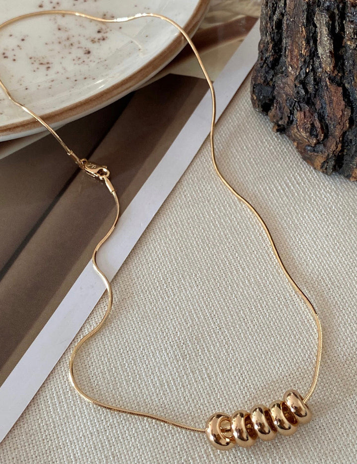 سلسلة أنيقة متألقة بخواتم دائرية متلاصقة تعكس البساطة والرقي على عنقك. مطلية بالذهب عيار 18 مكفولة سنة لتغير اللون.