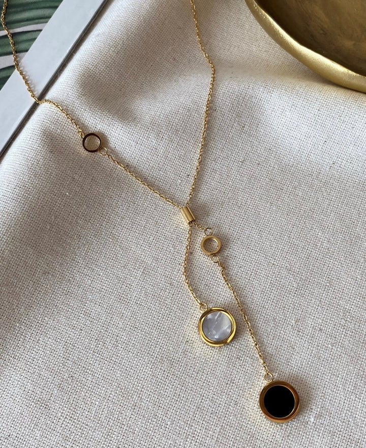 سلسلة أنيقة بتصميم رقيق مزينة بدائرتين متقابلتين بلونين مختلفين يعكسان التوازن والتباين بشكل فاخر. مطلية بالذهب عيار 18 مكفولة سنة لتغير اللون.