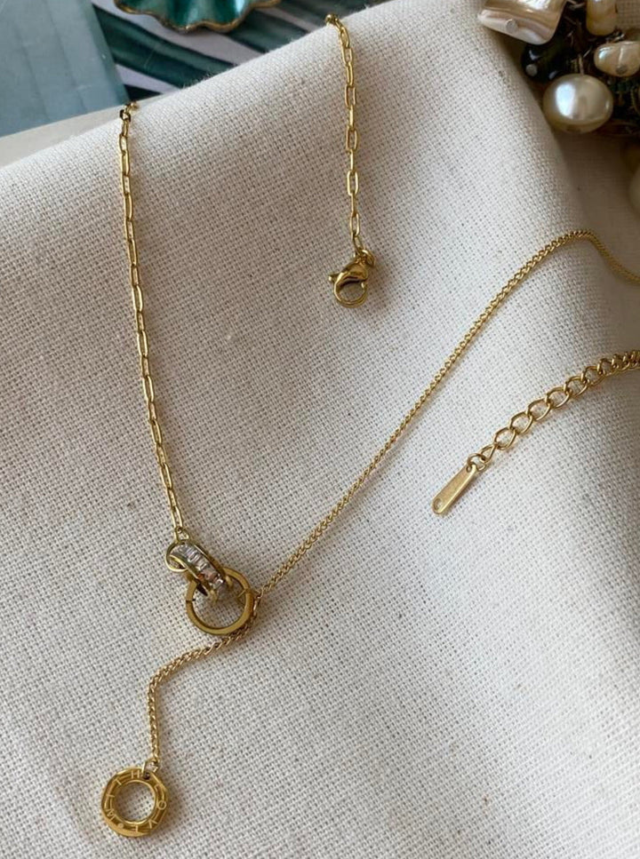 سلسلة أنيقة بتصميم الوصلة المستديرة المتدلية مزينة بأحجار لامعة تضفي بريقاً راقياً وعصرياً على إطلالتك. مطلية بالذهب عيار 18 مكفولة سنة لتغير اللون.