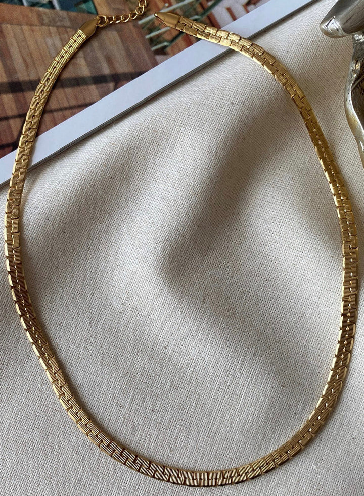 سلسلة أنيقة بتصميم الشريط المربّع المذهب الذي يضفي لمسة عصرية وجذابة على إطلالتك اليومية. مطلية بالذهب عيار 18 مكفولة سنة لتغير اللون.