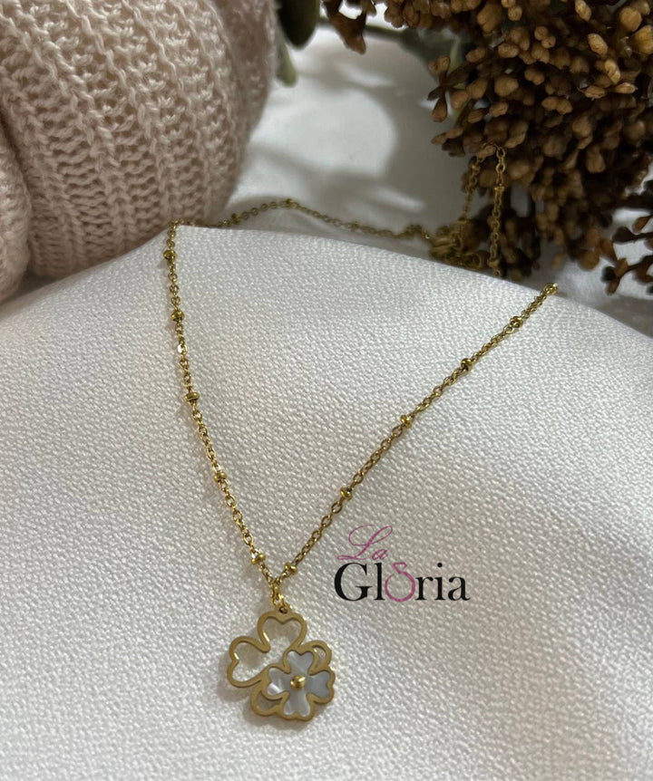 سلسلة ذهبية أنيقة مزينة بقلادة على شكل ورقة برسيم مزدوجة تعبر عن الحظ والسعادة مع لمسة من المينا البيضاء تضفي جمالاً ناعماً. مطلية بالذهب عيار 18 مكفولة سنة لتغير اللون.