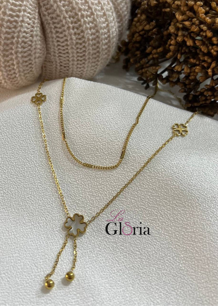 سلسلة أنيقة بتصميم مزدوج مزين بأزهار الحظ ذات التجويف الداخلي التي تضفي لمسة ناعمة وأنثوية. مزينة بحبات ذهبية صغيرة تتدلى بخفة لتعزيز الأناقة والرقي. مطلية بالذهب عيار 18 مكفولة سنة لتغير اللون.