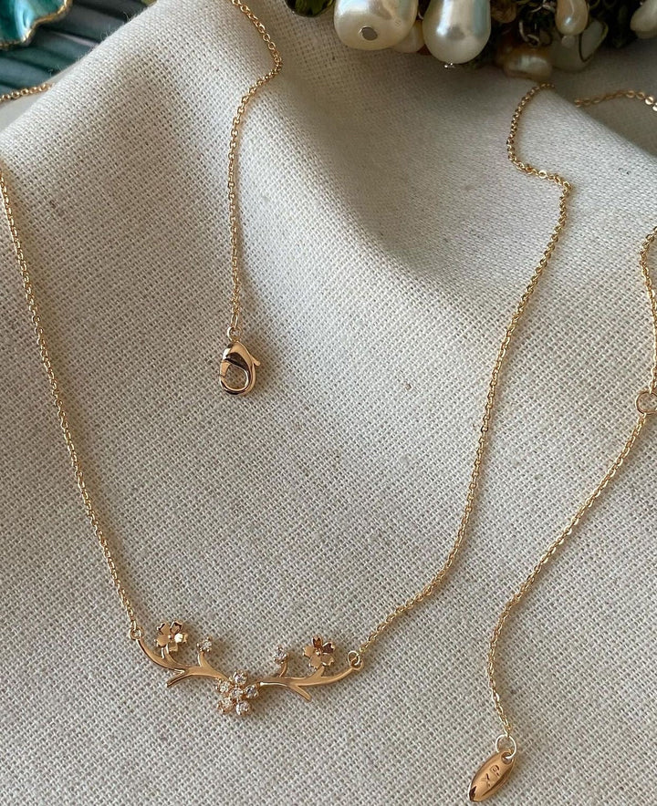 سلسلة أنيقة بتصميم غصن الساكورا مزين بأزهار متلألئة تضفي لمسة من الرقة والأنوثة على إطلالتك. مطلية بالذهب عيار 18 مكفولة سنة لتغير اللون.