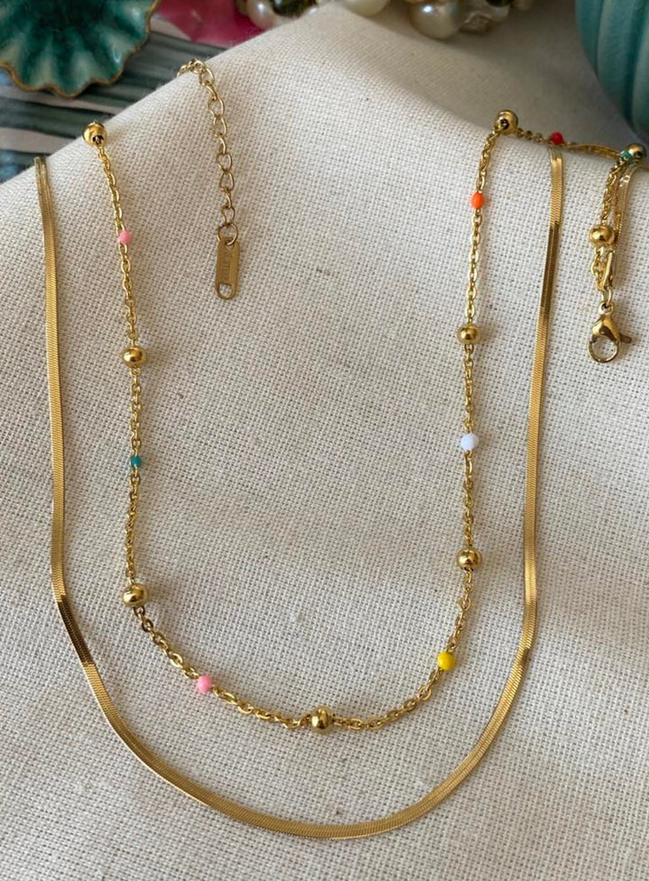 سلسلة طبقات الألوان أنيقة بتصميم مزدوج يجمع بين سلسلة رفيعة مسطحة وسلسلة أخرى مزينة بحبات ملونة وكرات ذهبية صغيرة تضفي لمسة عصرية وحيوية. مطلية بالذهب عيار 18 مكفولة سنة لتغير اللون.