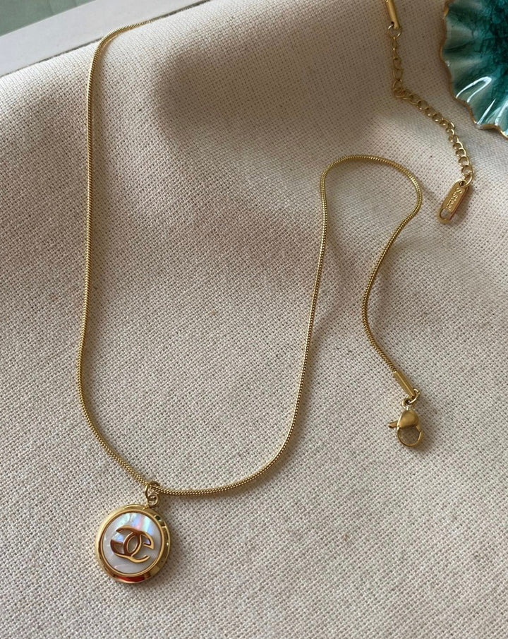 سلسلة أنيقة مزينة بقلادة دائرية تحمل لمسة عصرية بتصميم لامع مع خلفية صدفية تضفي رونقاً ناعماً وأنيقاً. مطلية بالذهب عيار 18 مكفولة سنة لتغير اللون.