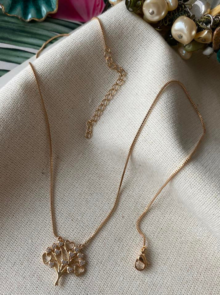 سلسلة أنيقة مطلية بالذهب عيار 18 مزينة بقلادة على شكل شجرة الحب تتلألأ بأحجار براقة وقلوب صغيرة تضفي لمسة رومانسية وجذابة. مطلية بالذهب عيار 18 مكفولة سنة لتغير اللون.