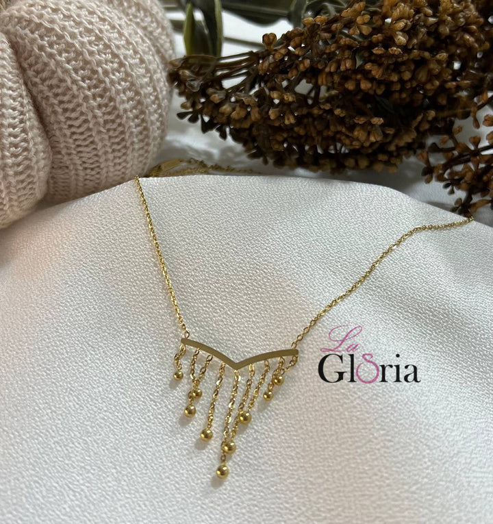 سلسلة ناعمة بتصميم حرف V مزينة بأهداب متدلية من كريات ذهبية تضفي حيوية وأنوثة على مظهرك اليومي. مطلية بالذهب عيار 18 مكفولة سنة لتغير اللون.