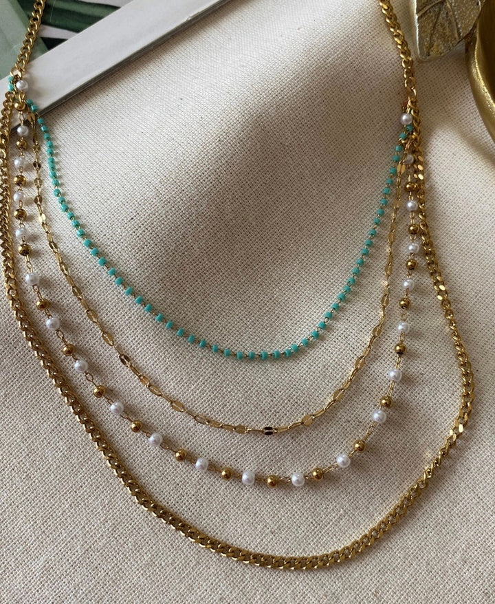 سلسلة أنيقة بطبقات متعددة تجمع بين خرز الفيروز واللؤلؤ الذهبي والذهبي اللامع بمزيج راقي يعبر عن الأناقة العصرية. مطلية بالذهب عيار 18 مكفولة سنة لتغير اللون.