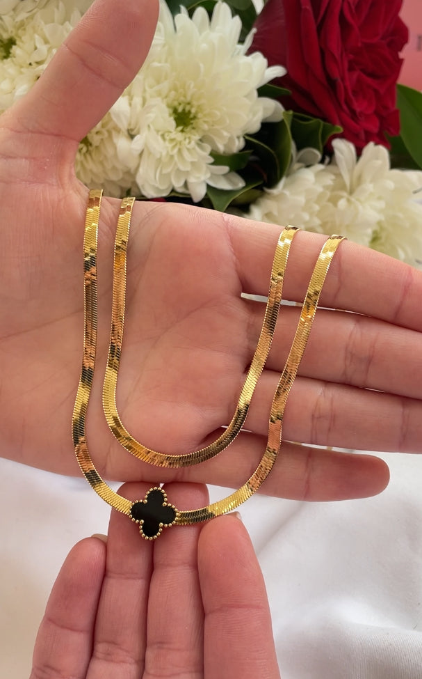 سلسلة مزدوجة بتصميم مسطح لامع يضفي تألقاً بارزاً على عنقك، مع قلادة على شكل برسيم مميزة بلون أسود أنيق ومحيط مزخرف. مطلية بالذهب عيار 18 مكفولة سنة لتغير اللون.