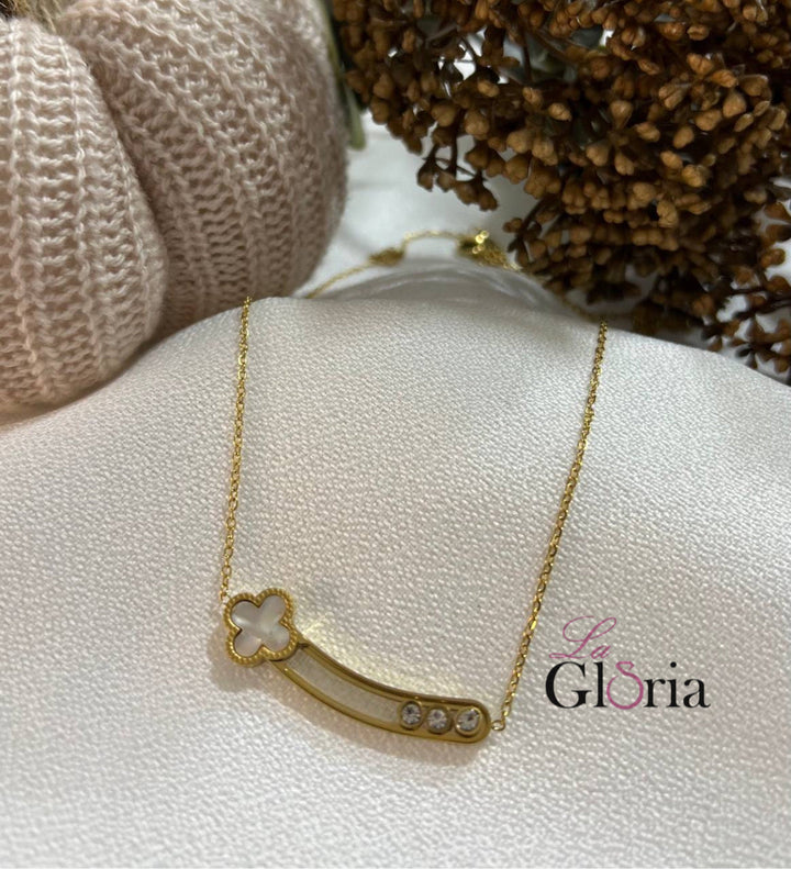 سلسلة ذهبية أنيقة مزينة بدرزة على شكل زهرة مع تصميم منحني مزين بثلاثة أحجار لامعة تضفي لمسة رقيقة وأنثوية. مطلية بالذهب عيار 18 مكفولة سنة لتغير اللون.