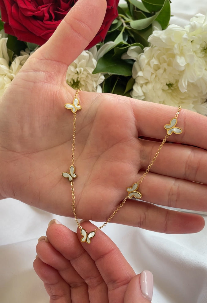 سلسلة أنيقة مزينة بتعليقة فراشات صغيرة من الصدف الأبيض تضفي لمسة ناعمة وأنثوية على إطلالتك. مطلية بالذهب عيار 18 مكفولة سنة لتغير اللون.