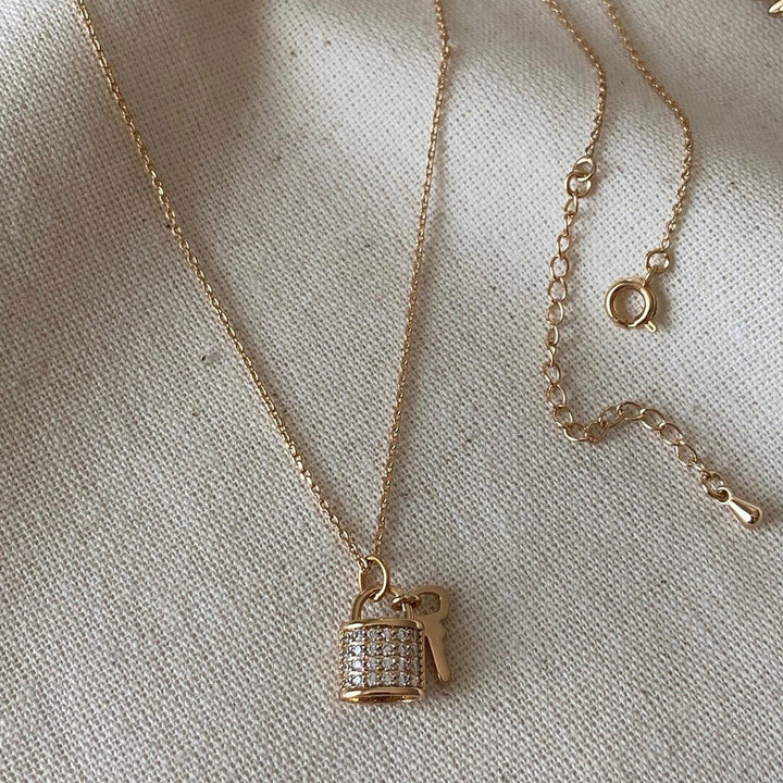 سلسلة أنيقة مزينة بستارة قفل صغيرة مرصعة بأحجار لامعة مع مفتاح ذهبي دقيق يضفي لمسة رومانسية فريدة. مطلية بالذهب عيار 18 مكفولة سنة لتغير اللون.
