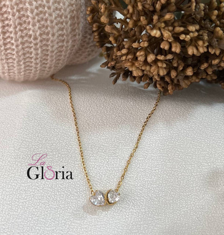 سلسلة ذهبية ناعمة مزينة بقلادة من قلبين مرصعين بأحجار كريستالية تضفي لمسة رومانسية أنيقة. مطلية بالذهب عيار 18 مكفولة سنة لتغير اللون.