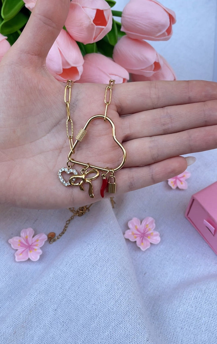 سلسلة أنيقة بتصميم قلب معدني ذهبي مزينة بتعويذات مميزة منها قلب مرصع بأحجار براقة، وشركة، وهلال أحمر، وقفل صغير تضفي لمسة عصرية وشبابية على إطلالتك. مطلية بالذهب عيار 18 مكفولة سنة لتغير اللون.